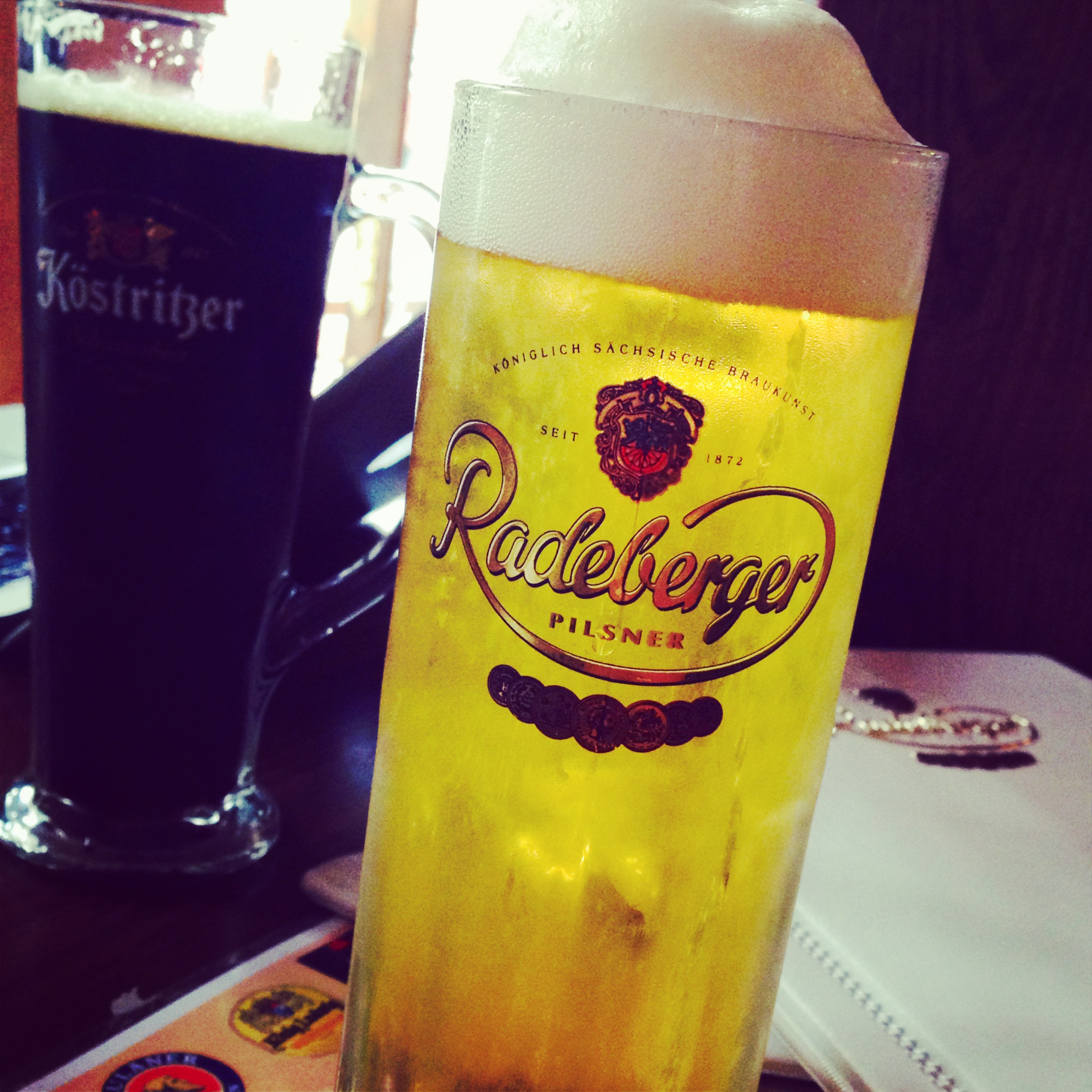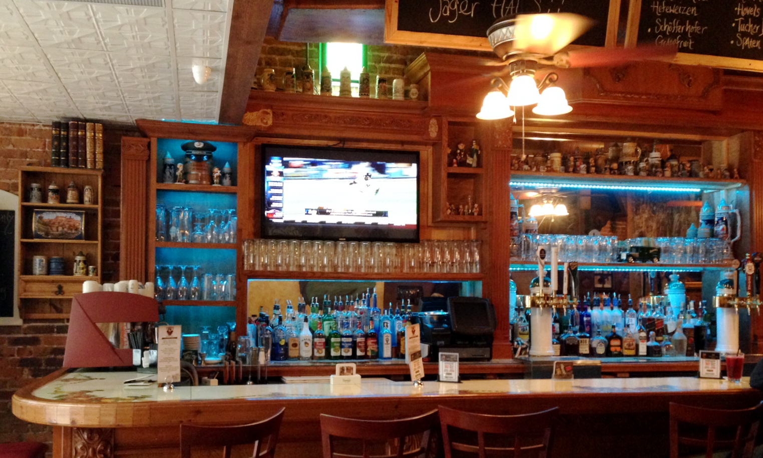 The decor is distinctly German, with beer steins adorning the bar, wood everywhere, typical German-style doorways and arches, and German artwork throughout.